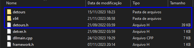 It's important to move the "detours.h" and "detver.h" files to your project directory, the same directory that contains the main file "dllmain.cpp". Afterwards, include them in your project using the "Solution Explorer" in Visual Studio 2022.