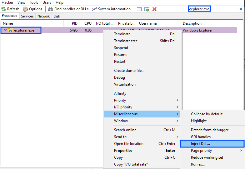 2 – Open the Process Hacker tool and search for "explorer.exe". Right-click on the process and go to "Miscellaneous > Inject DLL".